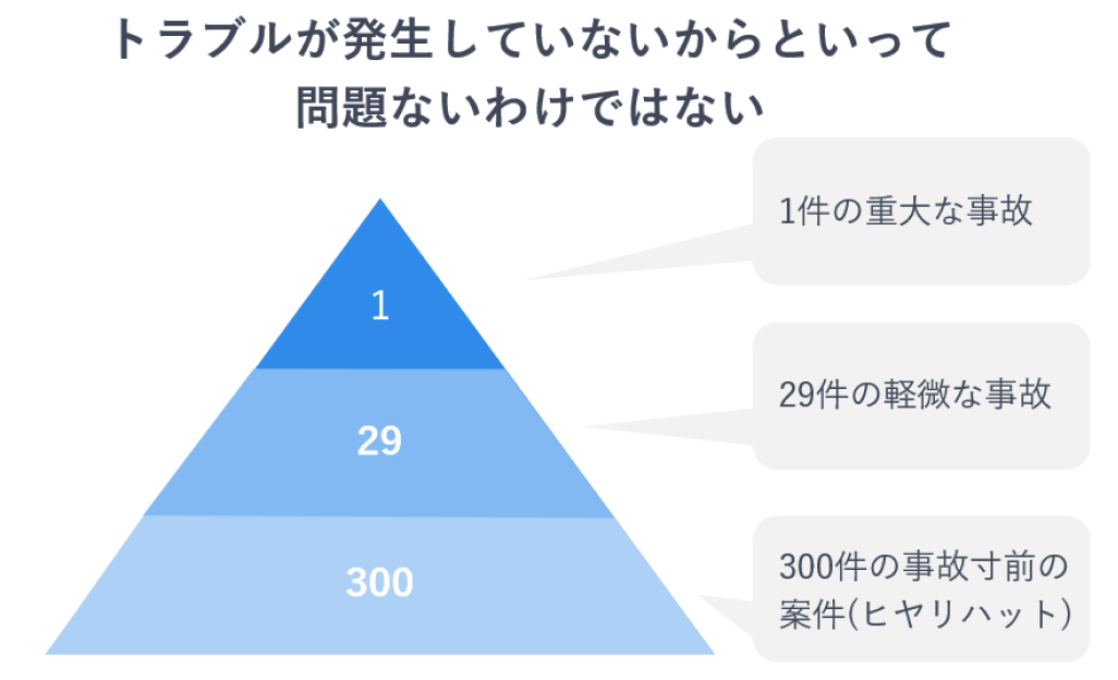 「ヒヤリハット」は、結果としてトラブルに至らなかった事象のため、見過ごされてしまうことが多いですが、記録を残しチーム内で共有して必要に応じた対策を講じることで、重大なトラブルを防ぐことに繋がります。