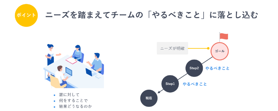 把握したニーズをその背景まで深堀し、チームで「やるべきこと」として落とし込んで、チームの「ミッション」を作成します。