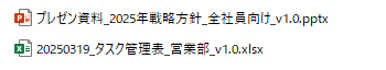 📂_チーム ┣ 📂_案件管理 ┃ ┣ 📂_提案資料 ┃ ┣ 📂_見積書 ┃ ┗ 📂_契約書 ┣ 📂_運用管理 ┃ ┣ 📂_資産管理 ┃ ┗ 📂_勤怠管理 ┃ ┗ 📂_データ分析 ┃ ┣ 📂_2024年度 ┃ ┗ 📂_2025年度 ┗ 📂_ナレッジ共有 📂_個人 ┣ 📂_ToDoリスト ┣ 📂_作業用フォルダ ┗ 📂_学習メモ |