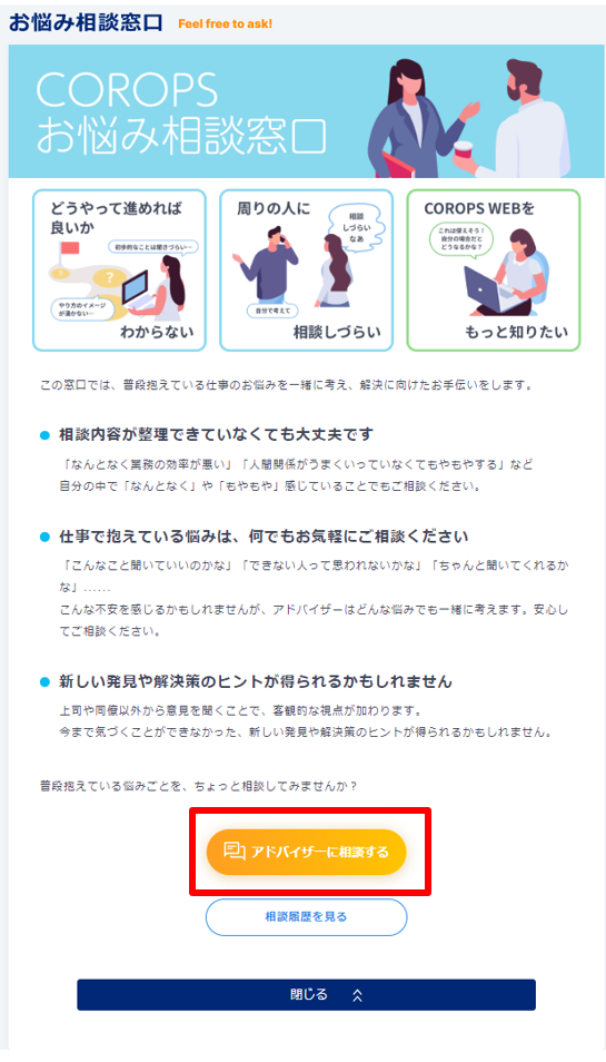 使い方にご不明点やお仕事のお悩みなどお問い合わせは、お悩み相談窓口までご連絡ください