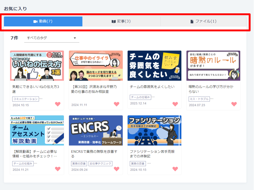 タブ「動画」「記事」「ファイル」をそれぞれクリック 登録しているお気に入りコンテンツが見られます