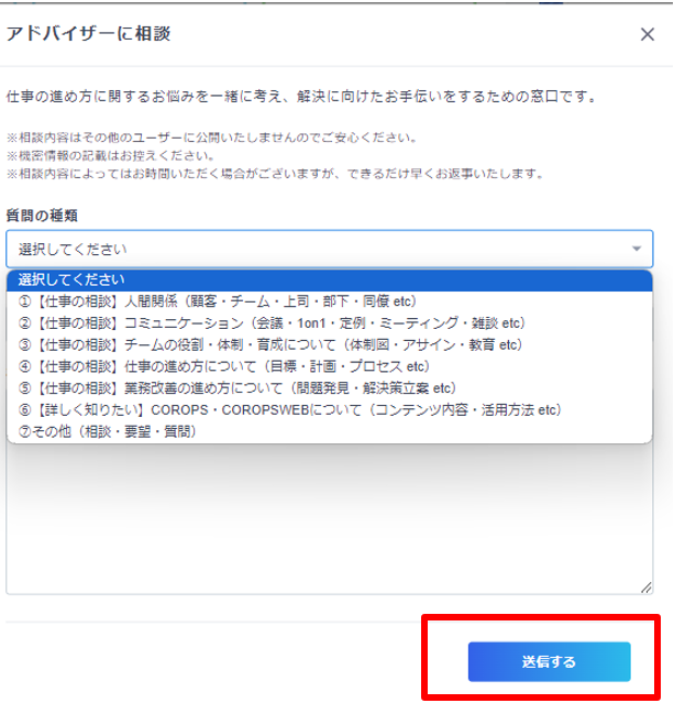 「質問の種類」を選択 > ご質問や相談内容を記入 > 「送信」ボタン をクリック