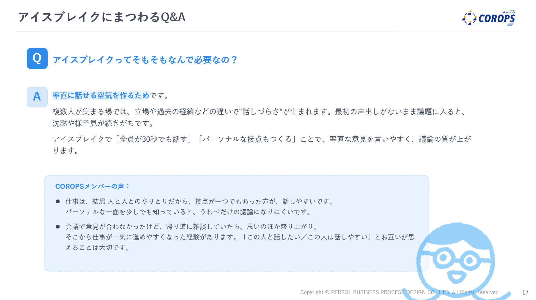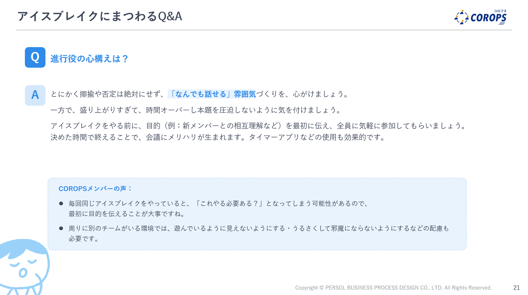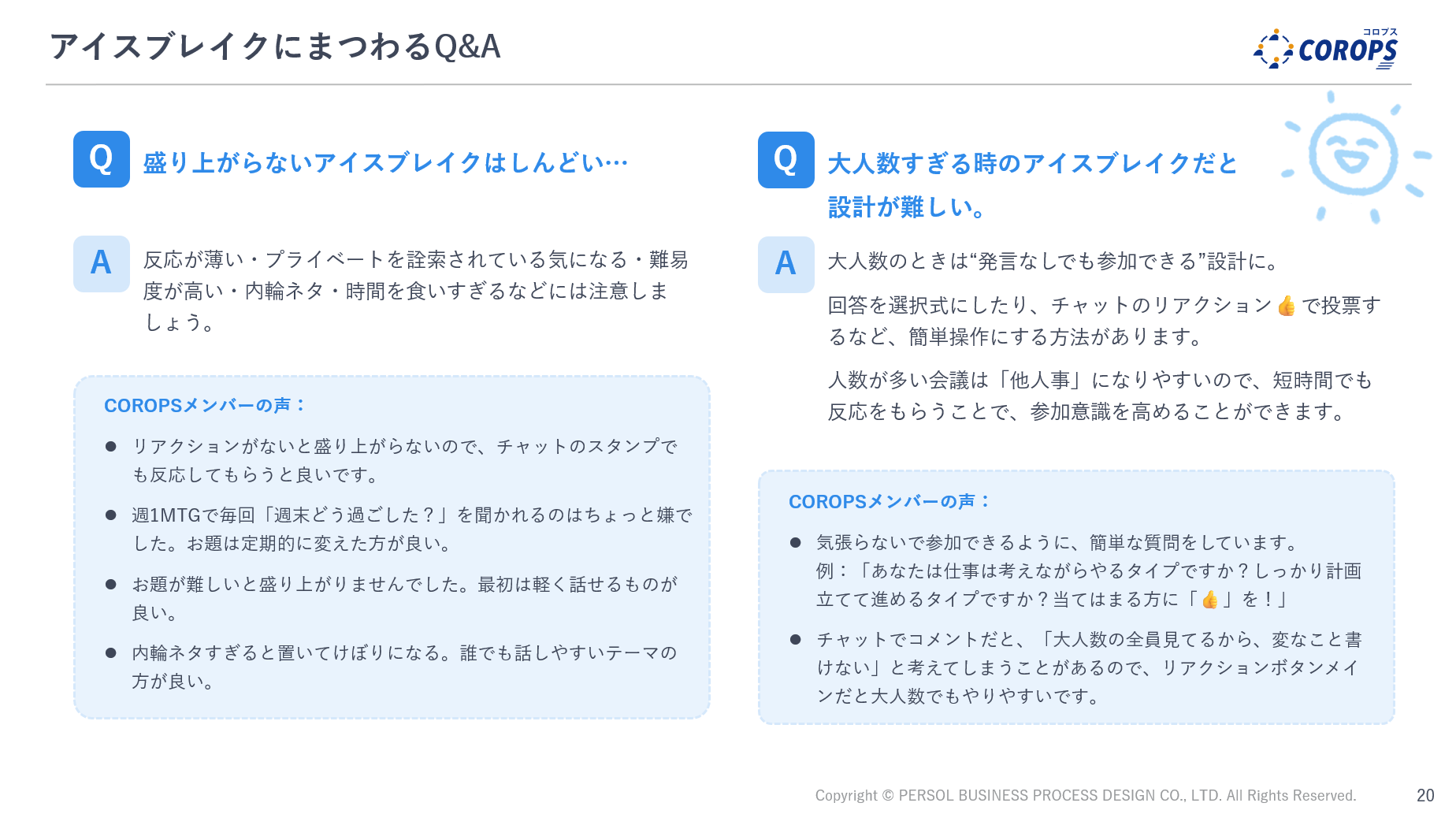 アイスブレイクに関して、よくある質問やお悩みにも答えています。