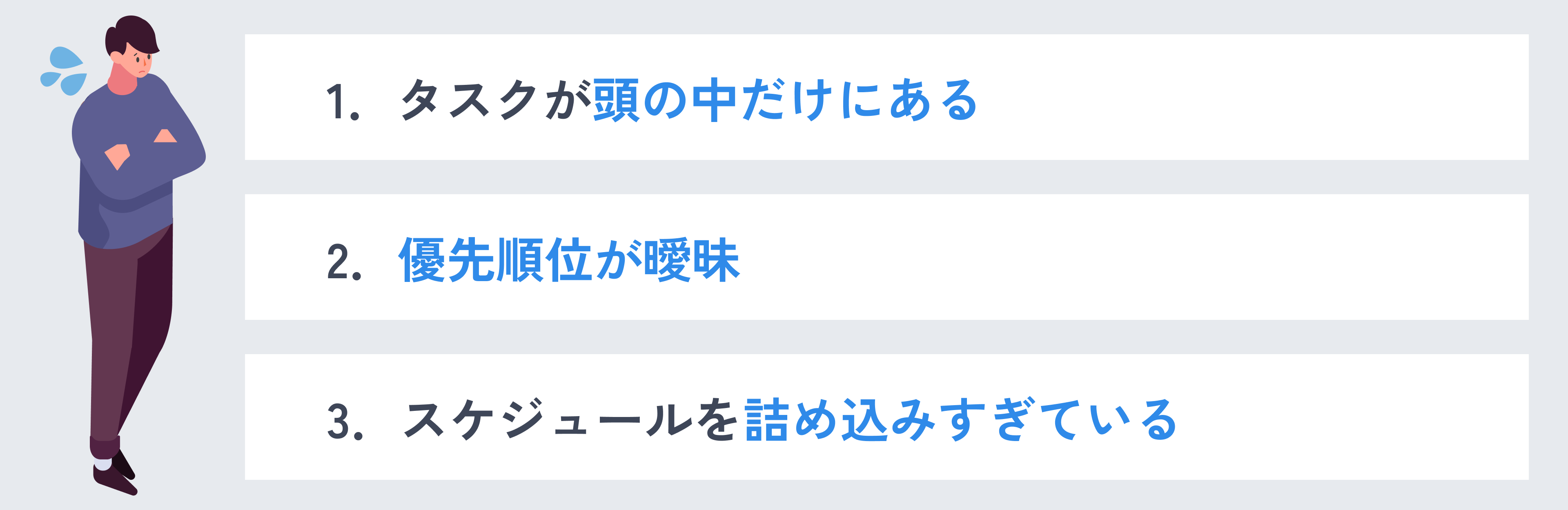 やるべきことが整理されていないと重要な事柄の見落とし無駄が増え、仕事の質の低下やミスにつながります。
