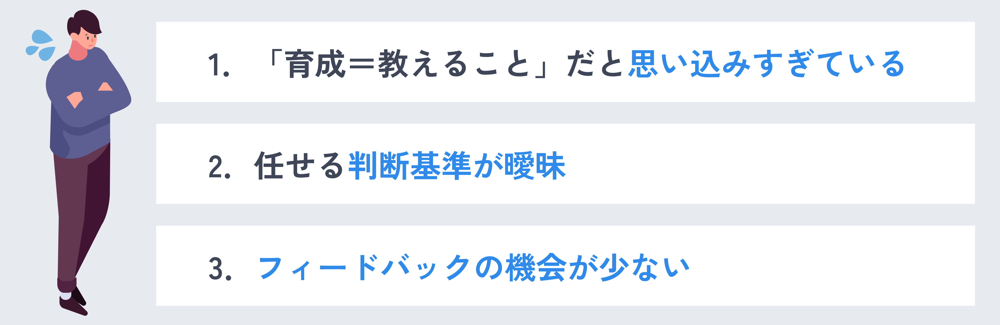 指導者が仕事を抱え込みやすくなり、部下に成長の機会を与えられません。そのため、部下の成長が遅れ、信頼関係の構築も難しくなります。