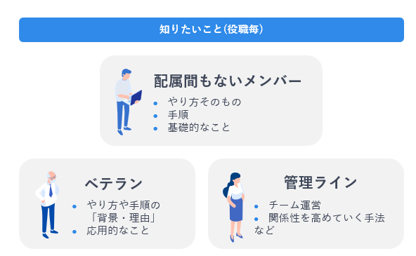 このように、メンバーの立場や役割によって「知りたいこと」や「困ること」は変化します。