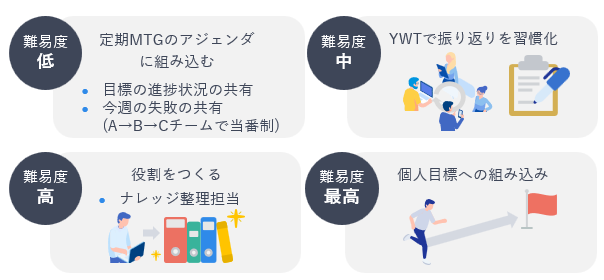 仕組み化の難易度に応じて段階的に取り入れることで、無理なくナレッジ文化を育てていくことができます。