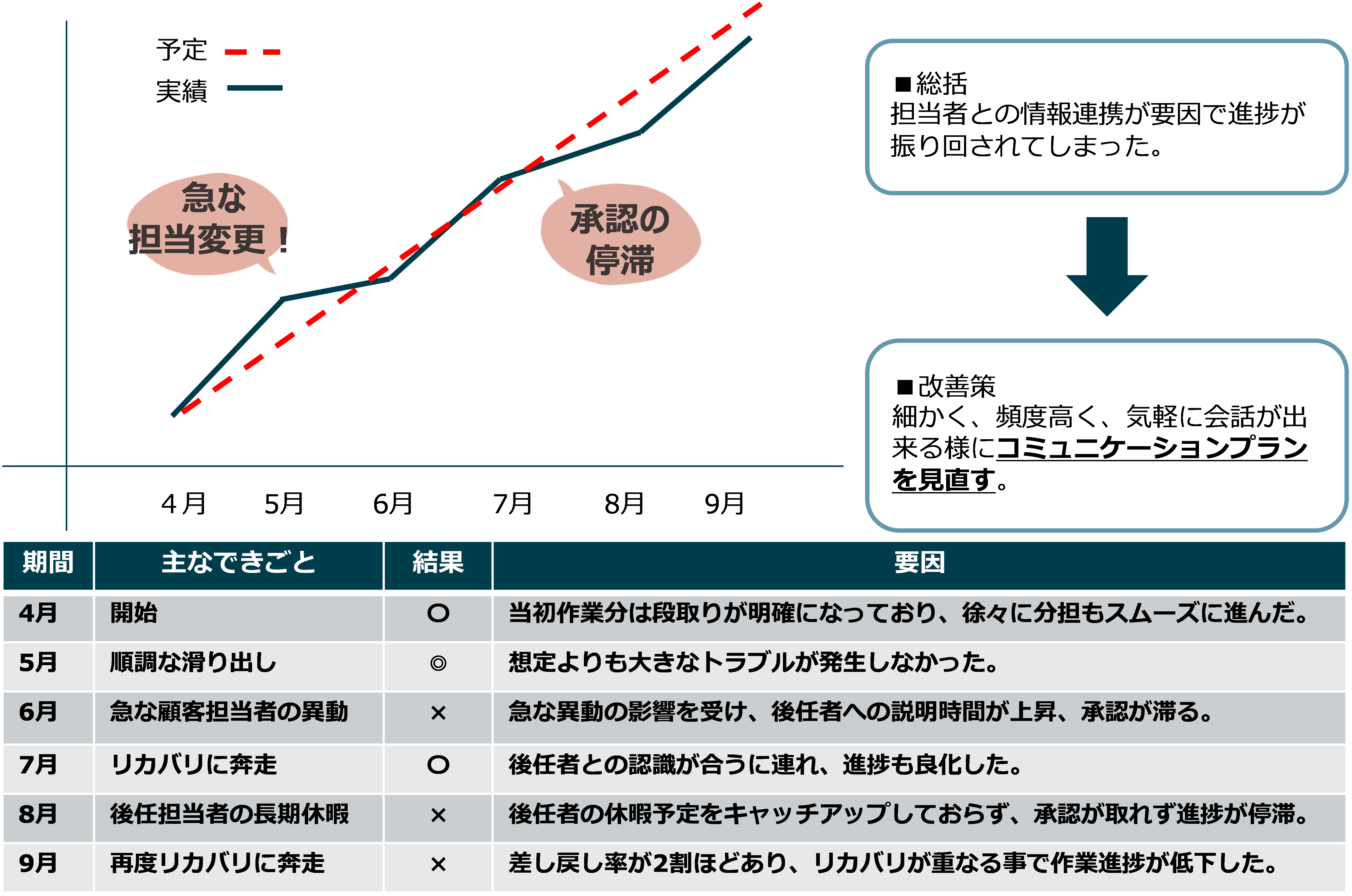 目標に対する振り返りは、結果だけでなく活動中の出来事も併せて振り返る事で、効果的な振り返りが出来ます。