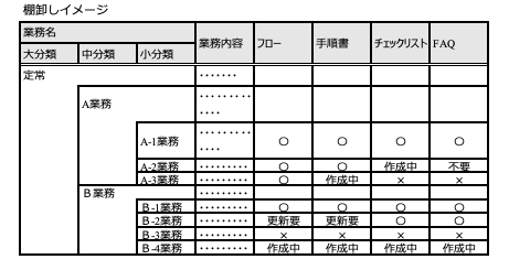 まず業務一覧をベースとし、既存のマニュアル類の棚卸しを行います。