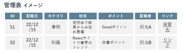 万が一、職場環境の制限などでツールが使用できない場合は、以下のイメージで管理表を作成し管理します。