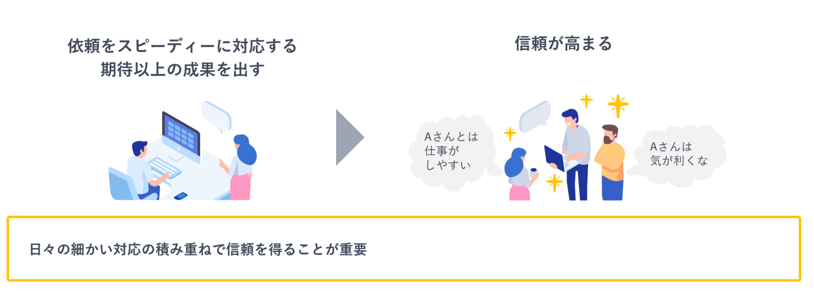 例え少しずつであっても相手の期待していること以上の成果を出し、スピーディーに応えることを続けると