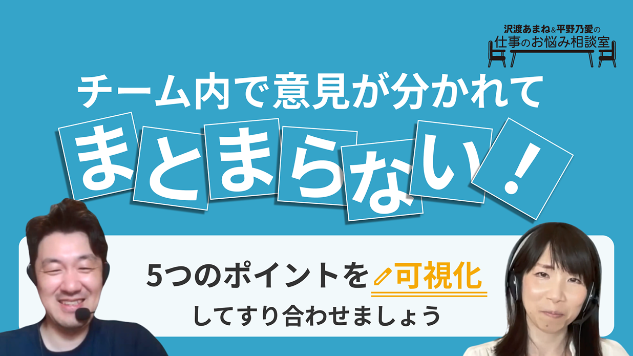 ▶ お悩み MTG中、メンバー同士で意見が割れたときにどう集約させればいいのか分からない。 意見が割れること自体は悪いことではないと思いつつも、毎回どちらの意見にするか決まらない。